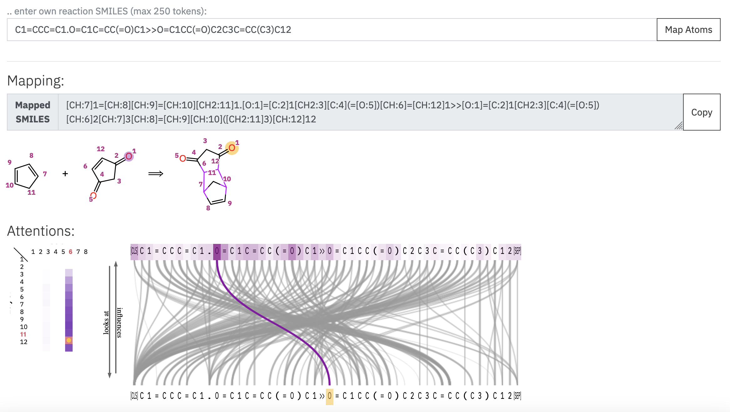 To obtain the atom mapping of a reaction, you can go to this site and paste your reaction SMILES. The application will then show you the mapped reaction smiles, as well as some visualization options, including: