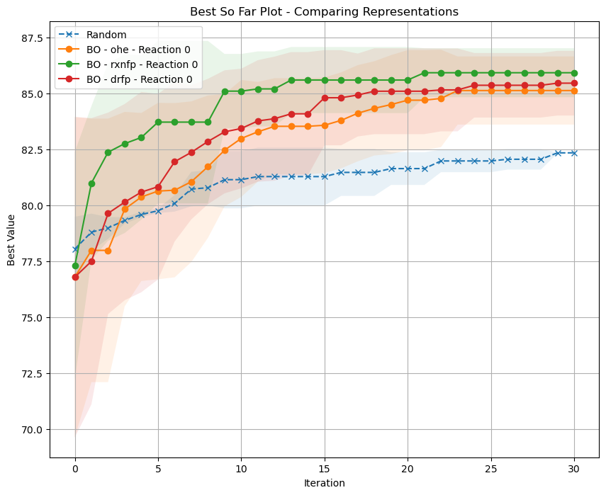 RXNFP (Reaction Fingerprint): RXNFP is a continuous, data-driven representation of chemical reactions derived from deep neural networks, specifically transformer models, trained for the task of reaction classification. As a fully data-driven method, RXNFP is adaptable and can provide a robust representation of different reactions. This adaptability, combined with the high performance of deep neural networks, enables RXNFP to efficiently represent the complex relationships between molecular structures and their reactivity, making it a strong candidate for use in Bayesian Optimization.